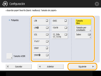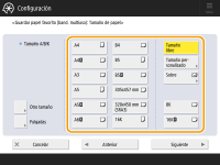 Si se establece <Especificar siempre> en <Opciones prefijadas de bandeja multiuso> a <Papel favorito>, aparecerá una pantalla desde la que podrá seleccionar su "Papel favorito" cuando vaya a cargar papel en la bandeja multiuso. <Opciones prefijadas de bandeja multiuso>