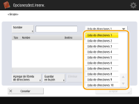 1 | Seleccione los destinos que desee registrar en un grupo y pulse <Aceptar>. ![]() Botón de tipo de destinoSeleccione (correo electrónico), (fax), (I-fax) o (archivo) para filtrar los destinos que aparecen en la lista de direcciones ( ). Pulse <Todo> para ver todos los destinos registrados. DestinoAparecen los destinos registrados en la lista de direcciones que ha seleccionado en el paso 6. De esa lista, seleccione el destino que desee registrar en un grupo. ![]() Si los destinos se gestionan mediante números de acceso, no aparecerán en la lista a menos que introduzca el número de acceso (Restringir el acceso a destinos registrados en la libreta de direcciones) después de pulsar <N.º de acceso>. <Detalles/Editar>Seleccione un destino y pulse <Detalles/Editar> si desea consultar las opciones del destino. Pulse <Aceptar> para volver a la pantalla anterior. <Buscar por nombre>Introduzca el nombre de destino. Vuelva a pulsar <Buscar por nombre> para volver a la pantalla anterior. Botón de la primera letraSeleccione el botón alfanumérico del primer carácter del nombre del destino. Pulse <Todo> para ver todos los destinos registrados. |