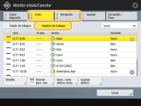 Registrar una dirección desde el historial de envíosPuede registrar una dirección en la Libreta de dirección o un botón de acceso directo a través del historial de envíos en la pantalla <Status Monitor>. Esto le ahorrará el esfuerzo de introducir directamente el número de fax y, además, le ayudará a evitar el envío de un fax a un número incorrecto al introducir mal el número de fax. |