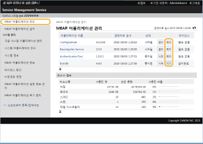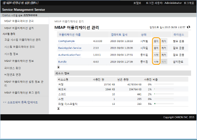 2 | 사용할 MEAP 응용 프로그램에 대해 [시작] / [중지]를 클릭하십시오. ![]() ![]() MEAP 응용 프로그램에 따라 기기를 다시 시작해야 하는 경우도 있습니다. 화면 안내에 따라 기기를 다시 시작하십시오. 메모리, 스레드, 소켓 또는 파일 기술자에 필요한 자원이 소진되면 [시작]을 클릭해도 응용 프로그램이 시작하지 않습니다. |