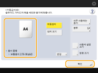 용지 크기 및 종류를 확인하고 <확인>를 누릅니다.