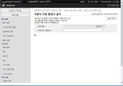 사용자 서명 추가 시 필요한 키와 인증서(사용자 인증서)를 리모트 UI에서 생성할 수 있습니다. 이 항목을 등록할 관리자를 지정하십시오. 키와 인증서가 등록되고 나면, 개인 인증으로 로그인한 사용자들은 특정 파일 형식으로 전송된 스캔 문서에 디지털 서명을 추가할 수 있습니다. 디지털 서명 추가