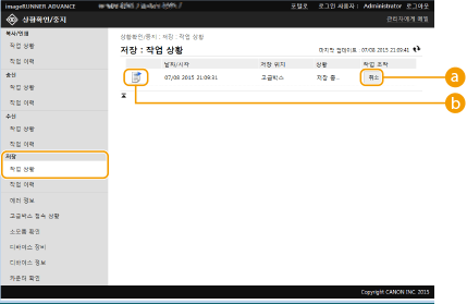 전송 대기중인 팩스 및 이메일, 수신된 팩스, 전송 대기중인 팩스의 상태를 확인할 수 있습니다. 문서 전송 및 수신 작업의 취소도 가능합니다.