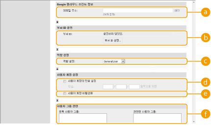 [사용자 관리] [인증관리]  [Google 클라우드 프린트 설정]을 클릭하십시오.
