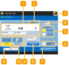 <홈> 화면에서 <저장파일 이용>을 누르고 <박스>, <고급박스>, <네트워크> 또는 <메모리 미디어>를 눌러 파일을 인쇄하는 경우 다음과 같은 설정 화면이 표시됩니다.