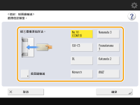 1 | 按下 <信封>。 信封紙張類型無法從 <紙張類型> 的詳細資訊畫面選擇。若要選擇信封紙張類型,請在 <註冊常用紙張(多用途紙盤)> 中註冊紙張類型,然後在步驟 2 按下 <常用紙張> 已註冊信封紙張類型的按鈕 <確定>。對於多用途紙盤註冊常用紙張尺寸和類型 |