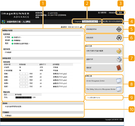 當您登入遠端使用者介面時,會顯示下面所示的入口網站頁面。本節說明入口網站頁面上顯示的項目以及基本操作。