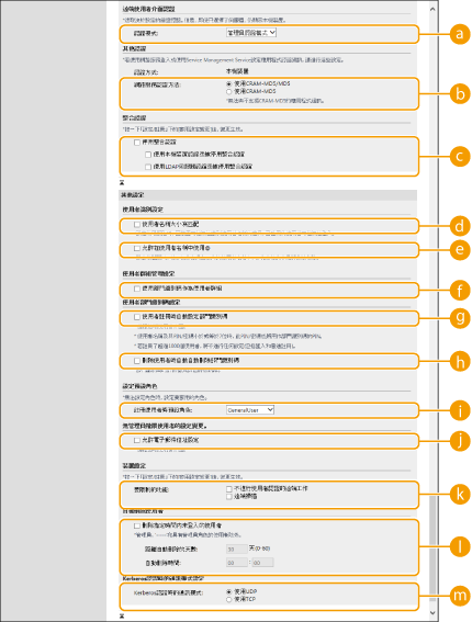 指定使用者登入方法 (登入方法) 和認證裝置 (認證裝置)。請注意,認證裝置必須在指定下列設定前設定。