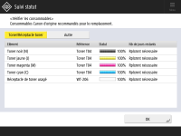 Vous pouvez vérifier la quantité restante de consommables à partir de l'interface utilisateur distante. Vérification du statut de la machine |