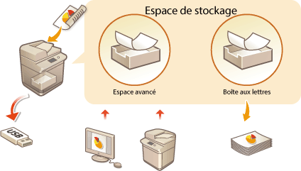 Le disque dur installé dans cet appareil contient un "espace de stockage" pour sauvegarder, partager et modifier des documents scannés. Un support de mémoire peut être connecté comme espace de stockage externe. Trouvez et utilisez l'espace de stockage idéal pour vos besoins.