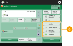 Il numero delle voci di impostazione nella schermata Funzioni di base e la posizione di visualizzazione variano in base alle funzioni. Non viene visualizzato alcun pulsante di scelta rapida se <Non assegnato> è impostato come scelta rapida. Il limite per il numero di scelte rapide per <Opzioni> registrabili è il seguente. Copia: 5 Fax: 4 Scansione e invio: 2 |