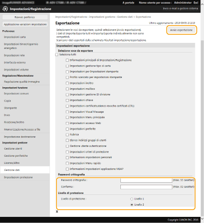 Inserire la password in [Password crittografia] selezionare il livello di sicurezza da [Livello di protezione] fare clic su [Avvio esportazione]  [OK].