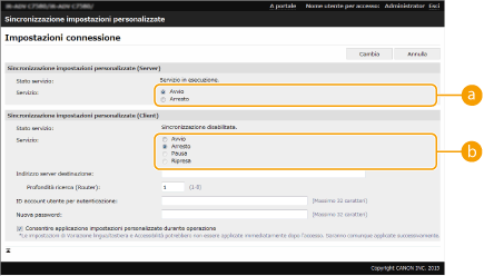 Controllo del registro di comunicazione per la sincronizzazioneÈ possibile controllare il registro di comunicazione dalla schermata per la sincronizzazione delle impostazioni personalizzate. È anche possibile scaricare il registro come file. Quando la macchina server non è in grado di comunicare temporaneamente, "Avviso" viene registrato come livello. "Errore" viene registrato come livello quando la quantità massima di dati che è possibile registrare è stata superata o in caso di errore nell'autenticazione con la macchina server. Impostazioni di sincronizzazione sempliciPer le stampanti multifunzione Canon nello stesso router, è possibile avviare la sincronizzazione delle impostazioni personalizzate dal pannello comandi. Per la macchina server: Premere (Impostazioni/Registrazione) <Impostazioni gestione> <Gestione periferiche> impostare <Sincronizzazione impostazioni personalizzate (Server)> su <Abilita>.Per una macchina client: Premere (Impostazioni/Registrazione) <Impostazioni gestione> <Gestione periferiche> impostare<Sincronizzazione impostazioni personalizzate (Client)> su <Abilita>.Se si utilizza la macchina come macchina server/client, impostare anche <Sincronizzazione impostazioni personalizzate (Client)> su <Abilita>. Come metodo di autenticazione deve essere abilitata l'opzione Autenticazione utente. Nota sull'annullamento della sincronizzazioneQuando in una macchina client si annulla la sincronizzazione delle impostazioni personalizzate, tale macchina non sarà più in grado di recuperare le impostazioni di ciascun utente registrato nella macchina server. Pertanto, si tenga presente che i dati personalizzati di una macchina utilizzata come macchina client potrebbero non essere aggiornati dopo l'annullamento della sincronizzazione delle impostazioni personalizzate. |