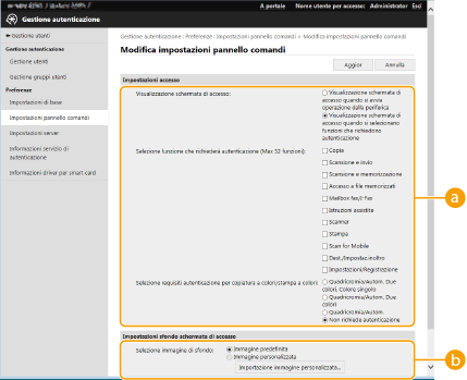 È possibile specificare quando visualizzare la schermata di accesso selezionando "quando si inizia a usare la macchina" o "dopo aver premuto un pulsante funzione". Se si seleziona l'opzione "dopo aver premuto un pulsante funzione", è possibile specificare le funzioni che richiedono l'accesso dell'utente. Le funzioni che non sono specificate sono disponibili per gli utenti non registrati.