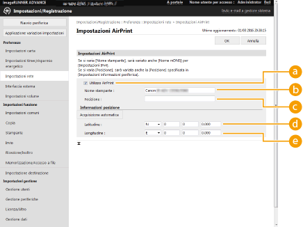 Se si accede con i privilegi di amministratore, è anche possibile modificare le impostazioni di AirPrint dalla pagina dedicata ad AirPrint.