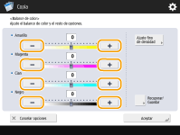 Puede registrar hasta cuatro opciones después del ajuste. Después de ajustar el color, pulse <Recuperar/Guardar> seleccione un botón entre <C1> y <C4> pulse <Guardar> <Sí> <Aceptar>.![]() ![]() Para recuperar las opciones registradas, pulse <Recuperar/Guardar>, seleccione un botón y pulse <Aceptar>. Puede cambiar los nombres de los botones de <C1> a <C4>. Seleccione el botón que quiere cambiar, pulse <Cambiar nombre> y escriba otro nombre. Para eliminar las opciones registradas, seleccione el botón pulse <Eliminar> <Sí>. |