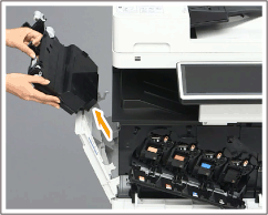 El procedimiento de sustitución del depósito de tóner residual también se muestra en la pantalla. Compruebe la información de la pantalla junto con el procedimiento siguiente.