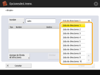 Puede crear un grupo de los destinos registrados en la lista de direcciones seleccionada. Por ejemplo, si selecciona <Lista de direcciones 2>, no podrá añadir un destino registrado en <Lista de direcciones 1> al grupo. El grupo creado se registra en la lista de direcciones que seleccione en este paso.