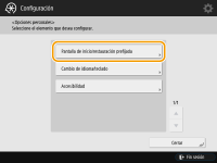 Configure la pantalla que aparece al iniciar el equipoSi el equipo está configurado para que los usuarios tengan que iniciar una sesión al encenderse ( Especificar cuándo mostrar la pantalla de inicio de sesión), aparecerá <Pantalla de inicio/restauración prefijada> como elemento en <Opciones personales>. La pantalla que aparece después de iniciarse el equipo se puede configurar para cada usuario. |