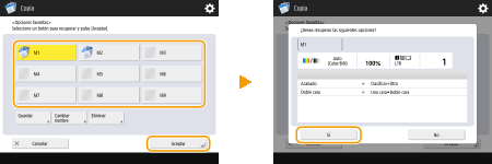 Para la función Copiar/Leer y Enviar, también puede configurar el equipo para no mostrar la pantalla de confirmación cuando se recuperen las opciones registradas.