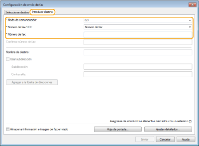 Haga clic en la pestaña [Introducir destino] y especifique el modo de comunicación y el número de fax que utiliza.