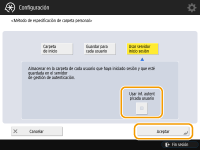 Una carpeta personal es una carpeta compartida por las pantallas siguientes. <Leer y enviar> <Red> en <Leer y guardar> <Red> en <Archivos guardados> |