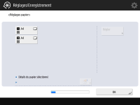 Vérifiez que le papier chargé dans les cassettes est correctement spécifié. ![]() ![]() Si les formats sont corrects, appuyez sur <OK>. Pour toute information sur l'écran et les instructions pour changer les réglages, voir la section Spécification du format et du type de papier dans la cassette à papier. S'il ne s'agit pas d'une session administrateur, passez à l'étape 10. | |