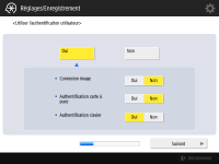 Il est impossible de démarrer le guide de configuration dans les cas suivants.Si l'authentification utilisateur ou l'authentification par numéro de service est activée. Si l'authentification par numéro de service est activée. Si une authentification avec une carte est réalisée. |