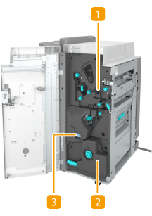 「ステイプルフィニッシャー・W」「中綴じフィニッシャー・W」に「パンチャーユニット・BT」を装着すると、パンチ穴をあけられます。 「中綴じフィニッシャー・W」に「小口トリマー・F」を装着すると、中とじされた出力紙の端を断裁してきれいにそろえることができます。詳細については、「小口トリマー・F」の取扱説明書を参照してください。 |