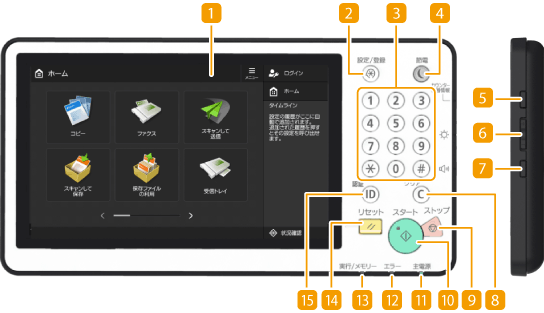 コピーやスキャンなど基本機能のボタンが配置されている「ホーム」を表示するときに押します。