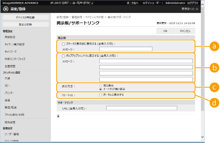 ユーザーへのお知らせをタッチパネルディスプレーに表示することができます。お知らせはタッチパネルディスプレーの最下部に表示したり、ポップアップ画面上に表示したりできますので、伝えたい内容やユーザーに応じて使い分けてください。ポップアップ画面上に表示するときは、リモートUIのポータルページに同じお知らせを表示させることもできます。設定にはAdministratorの権限が必要です。
