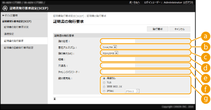 本機で生成した鍵に必要な証明書を、証明書を管理するSCEP(Simple Certificate Enrollment Protocol)サーバーへ発行要求します。SCEPサーバーから発行された証明書は、本機へ自動的に登録されます。証明書発行要求にはAdministratorの権限が必要です。