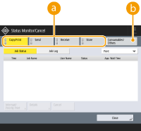 (Status Monitor), the <Status Monitor> screen is displayed. On this screen, you can check the printing status and transmission status, as well as the remaining amount of toner and memory level.