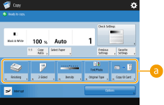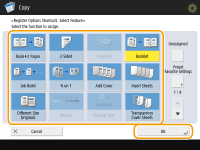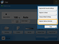 The number of setting items located on the Basic Features screen and the location to be displayed differ depending on functions. A shortcut button is not displayed if <Unassigned> is set as a shortcut. The limit to the number of shortcuts for <Options> you can register is as follows. Copy (Basic): 5 Copy (Express): 6 Fax: 4 Scan and Send: 2 If you have changed the Copy Basic Features screen to the Express Copy screen (Changing the Settings Quickly (Express Copy Screen)), select the button in step 3 and then press <Register>. |
