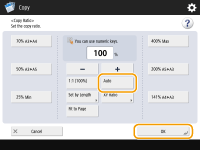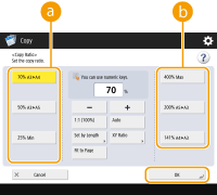 ![]() | You can enlarge or reduce by specifying the copy ratio (%). You can specify the vertical and horizontal ratios individually. Enlarging or Reducing Copies by Specifying the Copy Ratio | |