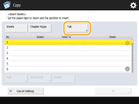 Specify the page to insert the tab paper, set the number of sheets, and select whether to print on the tab paper. If you want to print on the tab paper, include the original to be printed on the tab in the original document.