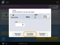 You can change or specify the following settings using <Change Settings> before scanning the next batch of originals (i.e., between batches): You need to set the necessary scan settings in advance, since you cannot change the settings in <Options> during the Job Build mode.