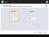 If you want to superimpose the form image on the back side when making a 2-sided copy, configure <Back Side>. To superimpose the same form image as the front side, press <Same as Front Side>. To super impose a form image different from the front side, press <Set> and proceed to step 5.