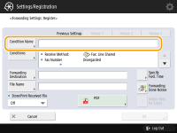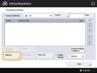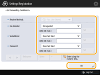 If you have added lines, you can also specify a particular line. In this case, select <Fax: Line 1>, etc. for <Receive Method>. You cannot change <Receive Method> after registering <Forwarding Settings>. To use forwarding settings with <Receive Method> changed, you have to register the forwarding settings again. |