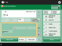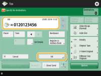 To check the total number of specified destinationsThe total number of specified destinations is displayed on the top right of the screen. This enables you to confirm that the number of destinations is correct before sending. ![]() To send with the sender informationYou can send with the sender's name and fax number. <TX Terminal ID> To check the statuses for sent documentsOn the <Status Monitor> screen, you can check the statuses for sent documents. This screen enables you to send faxes again or cancel sending after checking the statuses. Checking Status and Log for Sent and Received Documents When <Display Notification When Job Is Accepted> is set to <On>, the <Status Monitor> screen can be displayed from the following screen that is shown after a send job is received. <Display Notification When Job Is Accepted> ![]() When a transmission error occurs because the recipient's line is busyThe machine automatically redials after a certain period of time. You can change the settings such as how many times the machine redials and the interval between redials. <Auto Redial> To print the report for the results of sendingOn the Fax Basic Features screen, pressing <Options> <TX Report> enables you to set to automatically print the report listing the results of sending.To set this for each job from <Options>, it is necessary to select <For Error Only> or <Off> in <TX Report>, and then set <Allow Printing from Options> to <On>. When multiple sheets are fedScanning is stopped and the message is displayed on the screen. Follow the instructions to clear the jam. When you have cleared the jam, the resume job screen is displayed. If the machine mistakenly detects multiple sheet feeding, press <Do Not Detect Multi. Sheet Feed> to resume scanning. To set the machine in advance to not notify you of multiple sheet feeding, perform one of the following operations. Each time you send, press <Options> on the Fax Basic Features screen select <Detect Feeder Multi Sheet Fd.> to disable the setting. Set <Set Detection of Feeder Multi. Sheet Feed as Default> to <Off> (<Set Detection of Feeder Multi. Sheet Feed as Default>). When photos in the sent image are too dark or light colors in the background of color originals cannot be removedThe quality of the sent image may be able to be improved if the following conditions/settings are met. Job type: Fax (Memory Sending) or Scan and Send (Fax/I-fax) <Select Color>: <Black & White> (Scan and Send) <Original Type>: <Text> <Density> <Background Density>: <Auto><Resolution>: 200 dpi x 400 dpi, 300 dpi x 300 dpi*, 400 dpi x 400 dpi, or 600 dpi x 600 dpi* *Can be set for Scan and Send <Speed/Image Quality Priority for B&W Scan> Fax/I-Fax Send Jobs: <Quality Priority> (<Speed/Image Quality Priority for B&W Scan>)When multiple telephone lines are setYou can select the telephone line to use for sending faxes by pressing <Options> <Select Line>. For instructions on specifying fax line settings, see Fax Line Settings. |