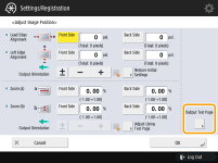 When you open the <Adjust Image Position> screen again after you close that screen by pressing <OK>, the values on screen are returned to <0>. However, the adjusted value is still effective. If you repeat steps, read off the value of register marks from new test page and input the new value.