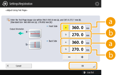 3 | Enter the length of the test page on both front and back sides  press <OK>. For example, if the measured length of <a> is 360.4 mm, enter 360.4. The difference in length (0.4 mm in this case), is automatically reduced, so that the image is printed in the correct size. <a>Enter the measured length of <a> mark on the test page. <b>Enter the measured length of <b> mark on the test page. As necessary, try printing the test page again and then check the correction amount. |