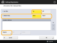 Set <Use Filter> to <On>, select <Default Policy>, then press <Register>.