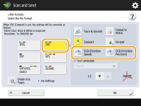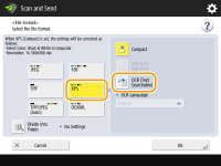 ![]() | This mode enables you to perform OCR (optical character recognition) to extract data that can be recognized as text from the scanned image and create a PDF/XPS/OOXML (pptx/docx) file that is searchable. You can also set <Compact> if you select PDF or XPS as the file format. For information on the optional products required to use this function and the file formats, see System Options. |