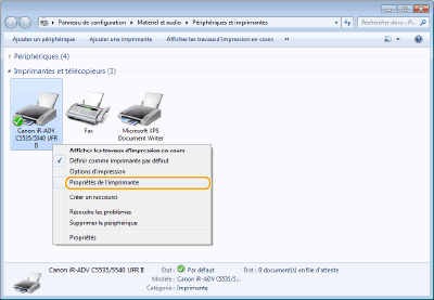 Cliquez avec le bouton droit sur l'icône de l'imprimante, puis cliquez sur [Propriétés de l'imprimante] (ou [Propriétés]).