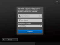 Lorsque l'écran de connexion s'affiche, les utilisateurs autorisés et enregistrés doivent s'authentifier pour faire fonctionner l'appareil. Pour se connecter, chaque utilisateur doit saisir son propre nom d'utilisateur et son mot de passe. Cette opération garantit la sécurité de l'appareil. De plus, les utilisateurs peuvent utiliser l'appareil pour personnaliser l'affichage et les paramètres en fonction de leurs préférences. Les éléments qui s'affichent sur l'écran de connexion varient en fonction des paramètres de gestion des utilisateurs. Procédez à la connexion selon les éléments affichés.