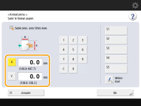 Appuyez sur <X> ou <Y> pour saisir la longueur de chaque côté avec le clavier numérique. ![]() Si vous enregistrez les formats de papier que vous utilisez fréquemment sur les touches <S1> à <S5>, vous pouvez les appeler en appuyant sur une seule touche. Enregistrement de papier de format libre (papier de format personnalisé) | |