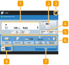Appuyez sur <Copie> (Écran <Accueil>) pour afficher l'écran des fonctions de base de copie.