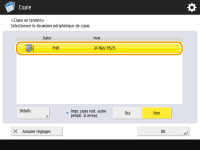 Le réglage pour <Impr. pges rest. autre périph. si erreur.> est uniquement valable lorsque <Finition> est défini. Même si vous réglez <Impr. pges rest. autre périph. si erreur.> sur <Oui>, les impressions restantes ne seront pas transmises dans les cas de figure suivants : Si les originaux pour copie en cascade sont en cours de numérisation Si vous utilisez <Couverture de dessus> et <Intercalaires> en combinaison lors de l'exécution d'une copie en cascade Si vous utilisez <Mélange d'originaux>, Sélection automatique du papier et <Recto verso> en combinaison lors de l'exécution d'une copie en cascade Si la copie en cascade est arrêtée sur l'appareil imageRUNNER ADVANCE auquel les impressions restantes ont été transmises Si une erreur est survenue sur l'appareil imageRUNNER ADVANCE auquel les impressions restantes ont été transmises Si la tâche de copie en cascade est presque terminée Si le temps de numérisation des originaux pour la copie en cascade est long Si vous utilisez le mode Numérotation des jeux de copie en combinaison avec le mode Copie en cascade Si vous définissez <Impr. pges rest. autre périph. si erreur.> sur <Oui>, l'impression n'est pas exécutée par l'appareil imageRUNNER ADVANCE dans lequel l'erreur est survenue, même après le rétablissement de l'appareil. Définissez le papier à utiliser pour la copie en cascade dans la même source de papier. Vous ne pouvez pas réserver une tâche de copie en cascade tandis qu'une tâche de copie en cascade est exécutée. Pour le mode Copie en cascade, le nombre spécifié de copies est divisé en deux moitiés entre l'appareil et l'imprimante en cascade. Si un nombre impair de copies est défini, l'appareil imprime une copie de plus que l'imprimante en cascade. Si vous souhaitez annuler la copie en cascade, annulez la copie pour l'appareil et l'imprimante en cascade. Une tâche de copie en cascade peut être annulée à partir de l'écran <Suivi statut> de l'imprimante en cascade. |