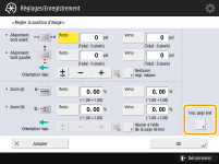 Lorsque vous ouvrez à nouveau l'écran <Régler la position d'image> après avoir fermé cet écran en appuyant sur <OK>, les valeurs sur l'écran sont remises à <0>. Cependant, la valeur réglée est toujours effective. Si vous répétez les étapes, lisez la valeur des repères enregistrés sur la nouvelle page de test et saisissez la nouvelle valeur.